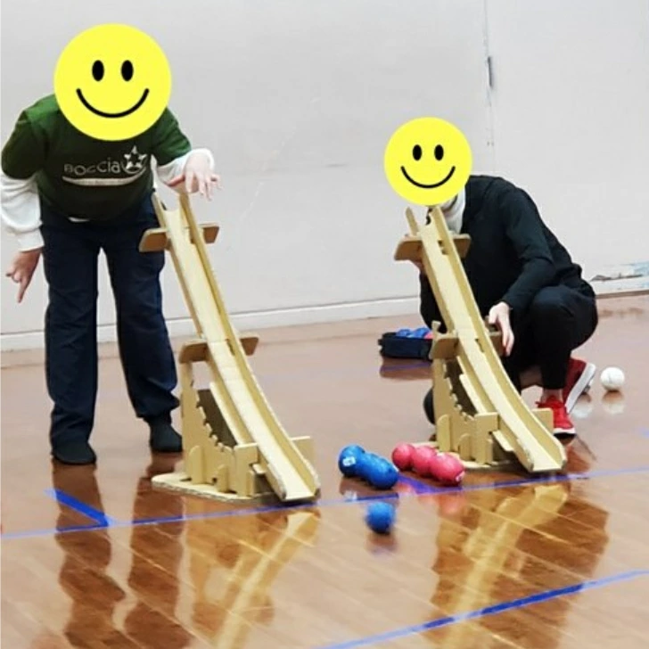 ジャックボール(目標球)と呼ばれる白いボールに、赤・青のそれぞれ6球ずつのカラーボールを投げたり、転がしたり、他のボールに当てたりして、いかに近づけるかを競います。障害によりボールを投げることができなくても、勾配具(ランプス)を使い、自分の意思を介助者に伝えることができれば参加できます。